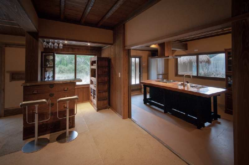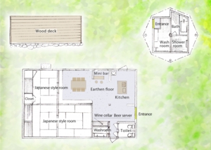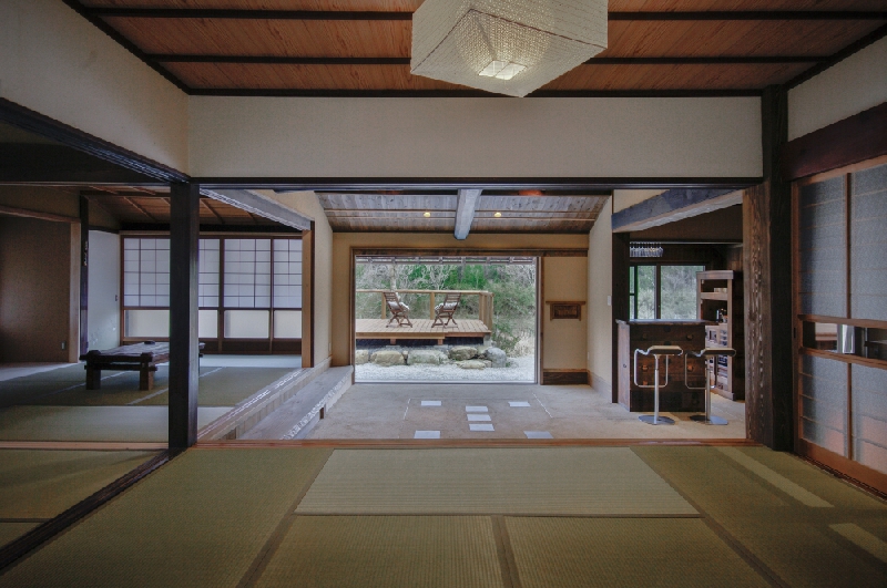 Located in the heart of a small hamlet adjacent to the clear flowing waters of Yura river, Eisa cottage has a large wooden deck from which you can admire the surrounding landscape. The fragrant cedar wood bathtub is positioned under a thatched roof and has a fantastic view that you can enjoy while you bathe. This modernised farmhouse retains its rustic charm, though we have added new features such as a small bar and a wine cellar. You can also visit this cottage with your pet if you like which is rare in Japan. Anyone wanting a traditional experience in a luxurious mountain getaway is sure to be delighted with a stay at Eisa.